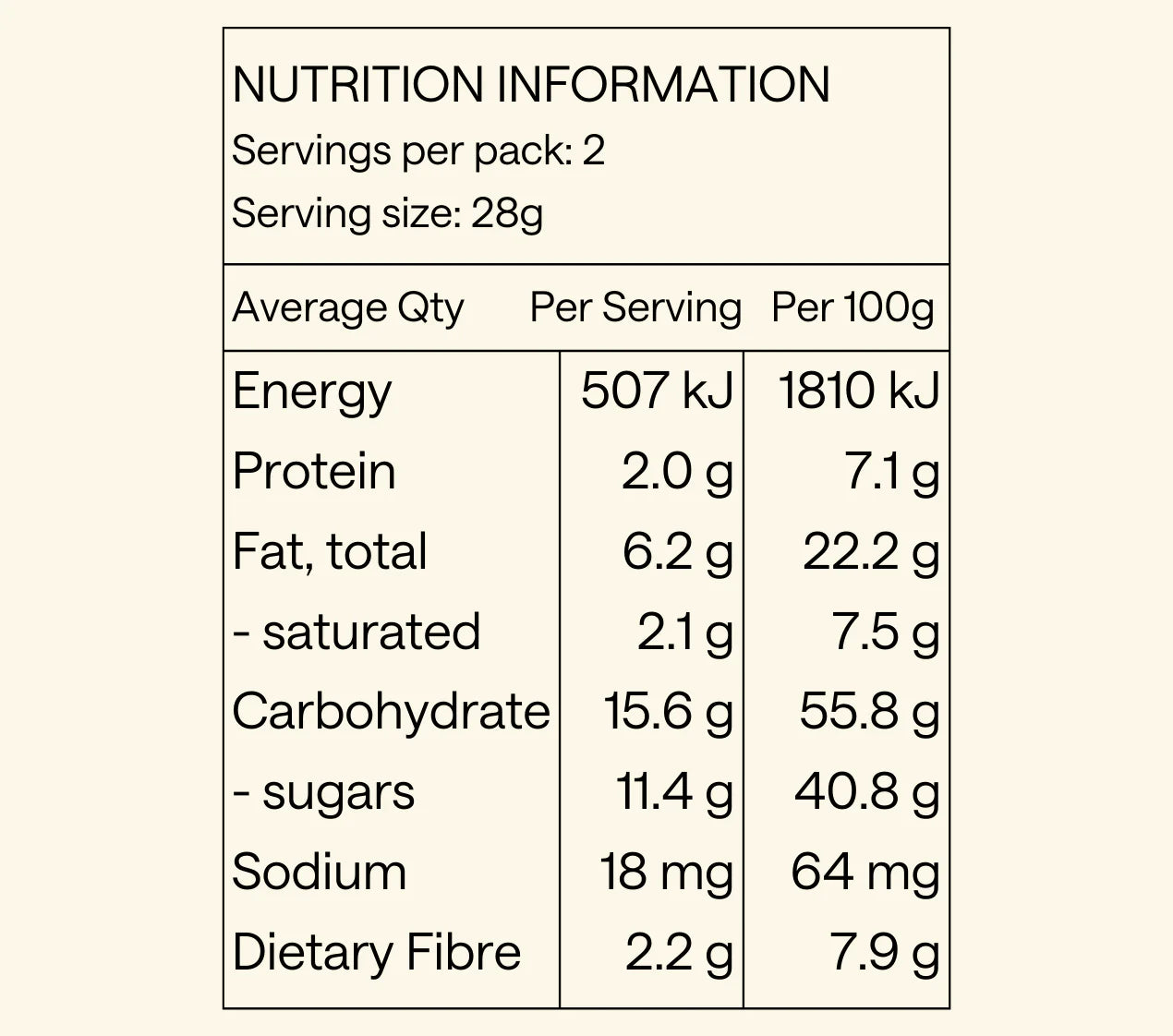 Medjool Dates*, Hazelnut Butter*, Cacao Paste*, Activated Buckwheat*, Cacao Butter*, Date Powder*, Tasman Sea Salt. Contains Hazelnuts. May contain traces of tree nuts, and peanuts. *Organic