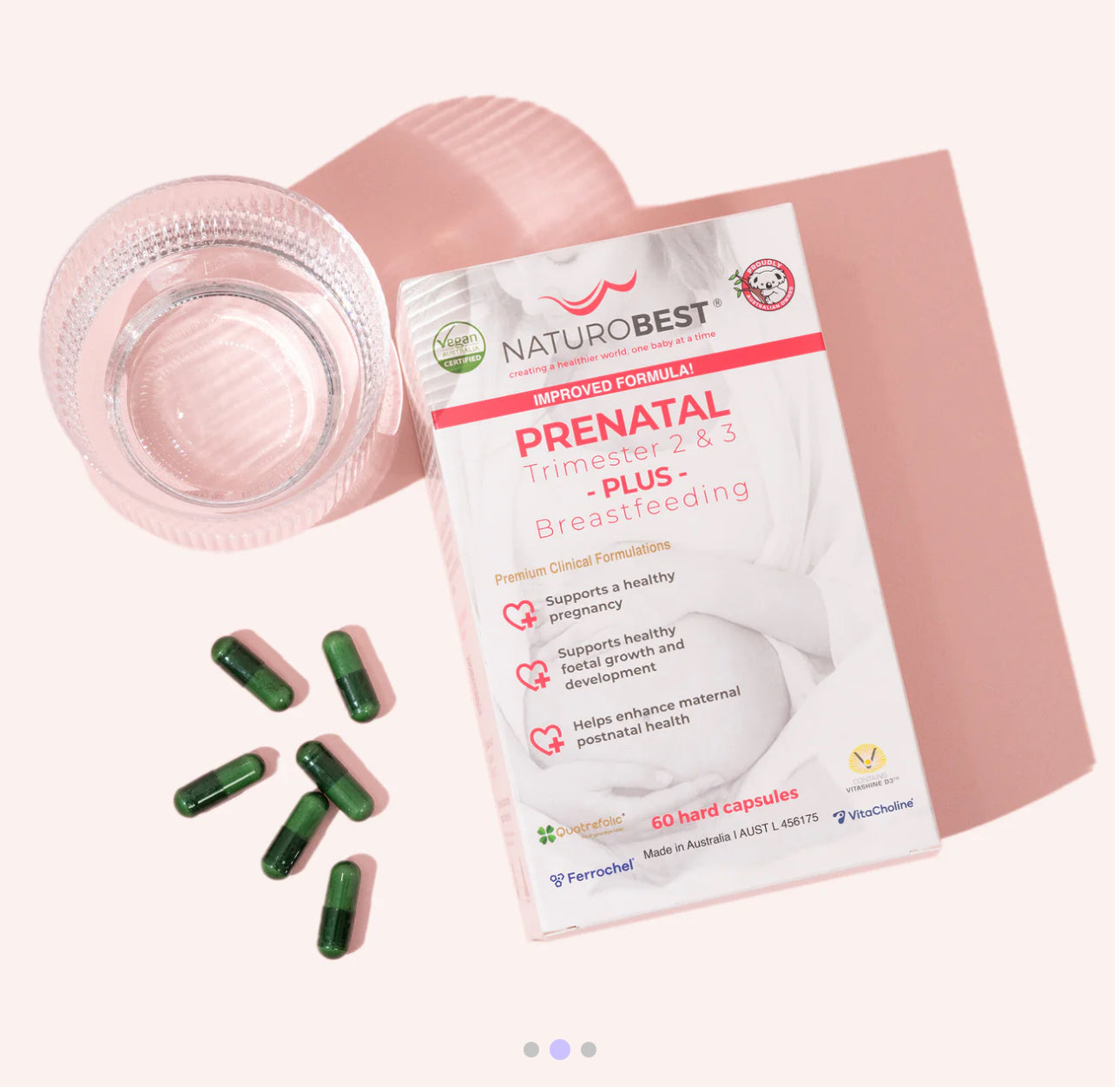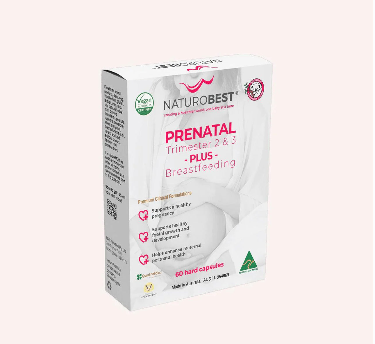 As your baby grows and develops, so too does your demand for nutrients. The need for iron in particular increases in the second and third trimesters, and this is the stage of pregnancy when you’re more likely to tolerate iron supplementation. This vegan-friendly prenatal vitamin is designed to support prenatal health by supplying required amounts of vitamins and minerals to contribute to a smooth and successful pregnancy. It also helps beyond birth by helping your body keep up with the demands of motherhood and breastfeeding. NaturoBest’s Prenatal Trimester 2 & 3 Plus Breastfeeding is Australia’s first prenatal multi with Quatrefolic®, the fourth generation folate and folinic acid, ideal for people who have genetic difficulties with folic acid metabolism. Clinically formulated by an experienced fertility naturopath, this daily prenatal multivitamin has been designed specifically to meet the increased demand for nutrients in the second half of pregnancy and breastfeeding. The low-excipient formula is suitable for vegans and vegetarians.