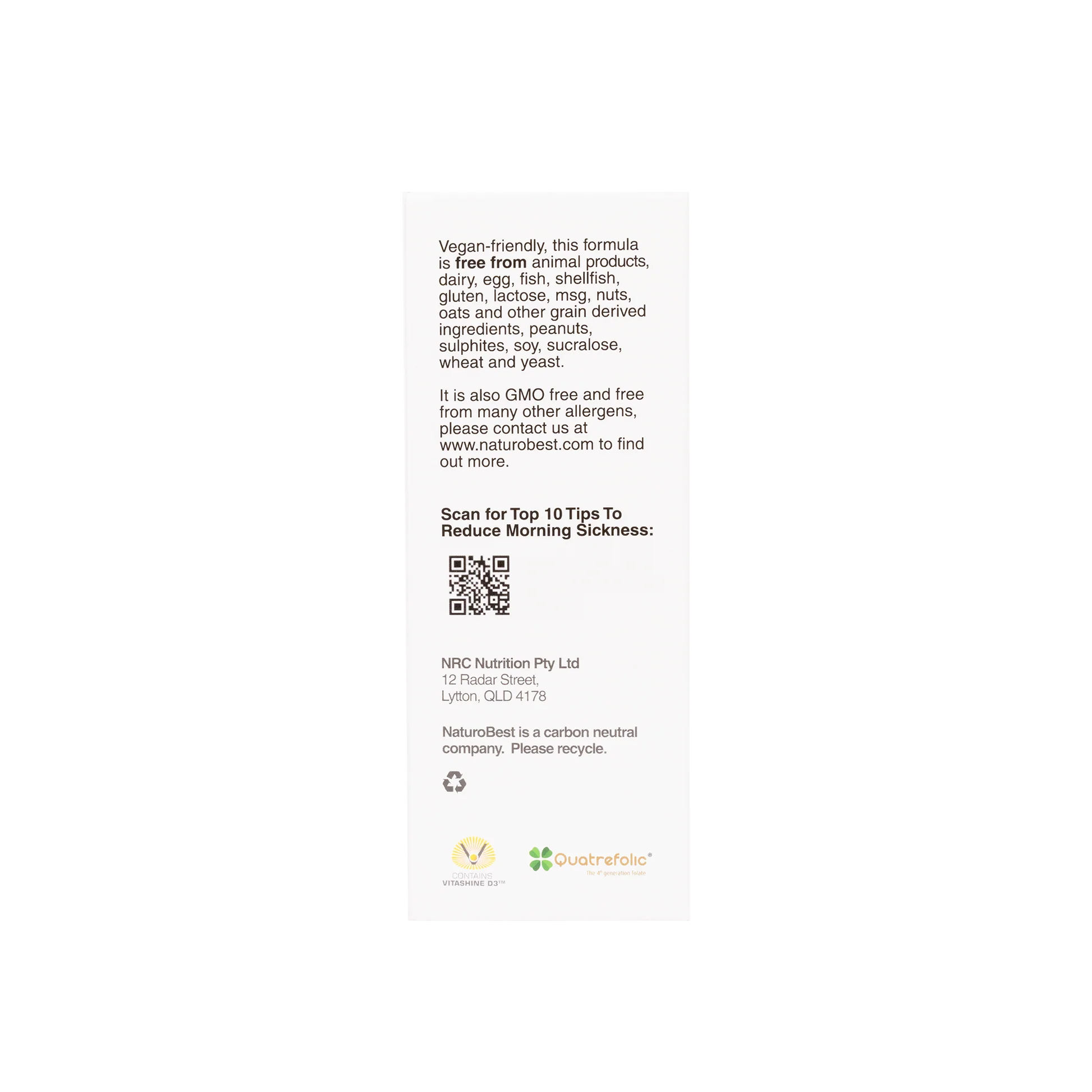 Vegan-friendly, this formula is free from animal products, dairy, egg, fish/shellfish, gluten, lactose, msg, nuts, oats and other grain derived ingredients, peanuts, sulphites, soy, sucralose, wheat, yeast, magnesium stearate, stearic acid and artificial colours, flavours and preservatives. This prenatal vitamin is also GMO free and free from many other allergens, please contact us to find out more.