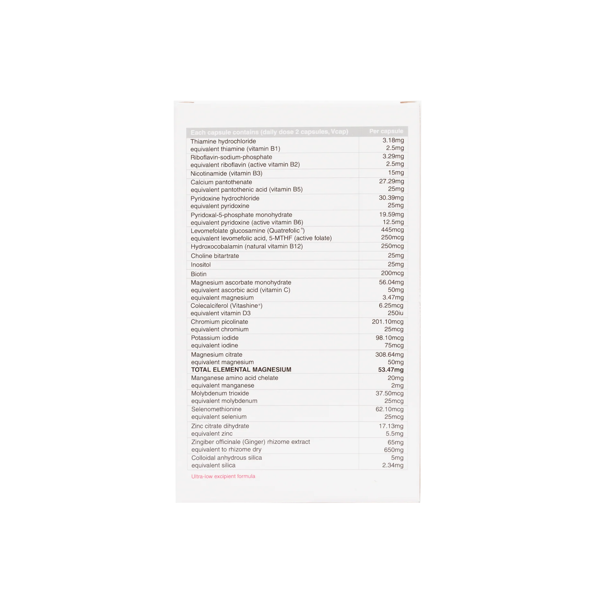 Provides active forms of vitamins B2, B6, B12 and folate and is free from copper. This is an ultra-low excipient formula.