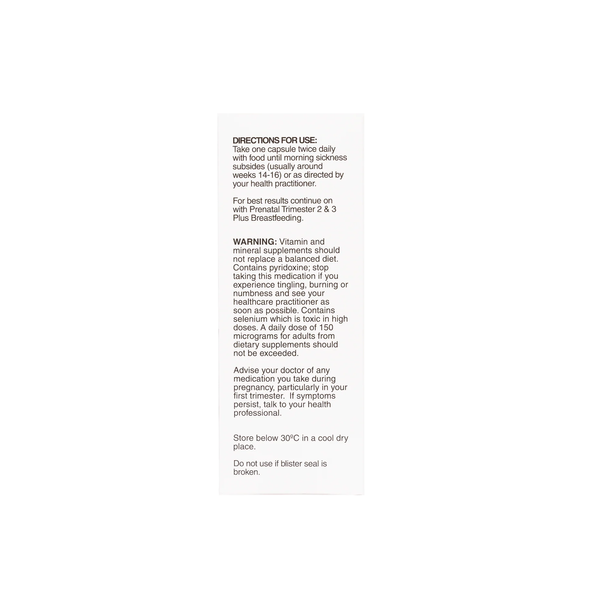 Does not contain iron. Iron supplementation in the first trimester may aggravate the symptoms of morning sickness. Seek advice from your health professional if you are iron deficient.