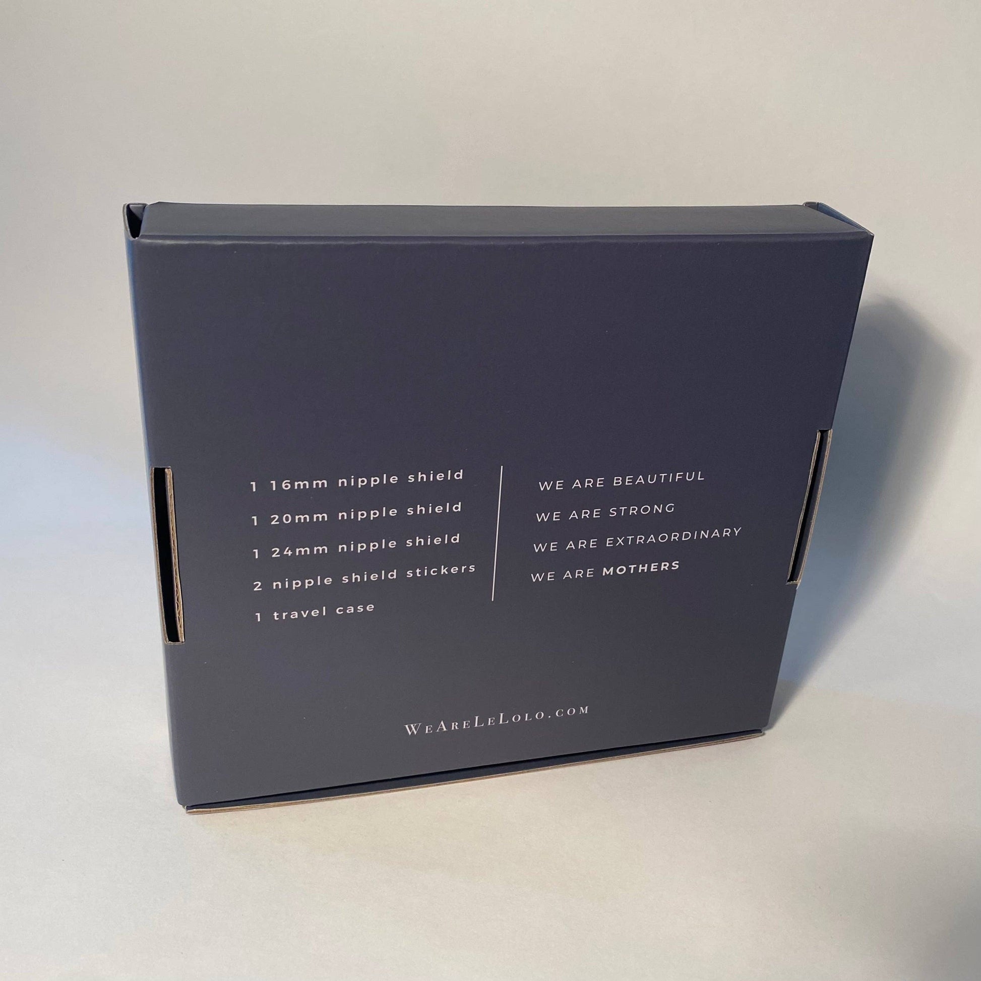 Each package includes (1) 16mm nipple shield, (1) 20mm nipple shield, (1) 24mm nipple shield, (2) nipple shield stickers, and (1) case